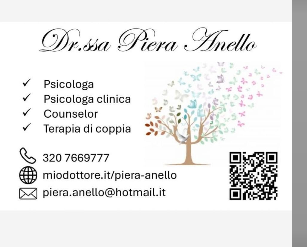 Quando curi una malattia puoi vincere o perdere. Quando ti prendi cura di una persona vinci sempre. (Patch Adams) Sono la Dottoressa Piera Anello, Psicologa Clinica laureata presso l’Università degli studi di Palermo, presentando una tesi specialistica sulla figura dello Psicologo delle Emergenze, sul trauma e sul Disturbo Post Traumatico da Stress. “Essere” e “fare” la Psicologa… non so esattamente il momento preciso in cui ho deciso di volere entrambe le cose, perché è un desiderio che è nato insieme a me. Ho sempre avuto interesse per il mondo psicologico proprio e altrui, sempre desiderato conoscere e comprendere i meccanismi mentali e le motivazioni sottostanti ai comportamenti, conoscere le diverse personalità e gli stili caratteriali che rendono gli individui così unici e tanto differenti tra loro e l’aver vissuto personalmente delle situazioni di sofferenza, mi hanno spinta e convinta maggiormente ad intraprendere il percorso volto a diventare una Psicologa. Mi occupo dell’analisi delle principali sindromi cliniche e dei disturbi della personalità, occupandomi di pazienti che soffrono di disturbi d’ansia e dell’umore, disturbi legati allo stress, problemi relazionali, personalità Borderline o Narcisistica, Dipendenza affettiva e abuso Psicologico, Disturbi da Stress Post- Traumatico. Sono inoltre molto sensibile al fenomeno della violenza contro le donne, sia fisica ma soprattutto psicologica, spesso nata tra le mura domestiche o negli ambienti di lavoro e spero di poter essere un punto di riferimento e un aiuto per tutte quelle donne vittime di abusi fisici e psicologici e manipolazioni relazionali, operate da soggetti tipicamente narcisisti e manipolatori. In merito al tema, purtroppo al giorno d’oggi molto diffuso, della violenza sulle donne, sono presente per dare sostegno e vicinanza alle donne che vivono situazioni disfunzionali ma che tengono dentro, sepolte sotto l’ombra del silenzio, per pudore o paura di non essere credute o comprese. Chi è reduce da una relazione con una personalità narcisista, subisce quello che viene comunemente chiamato “Trauma da narcisismo” (T.D.N.), i cui principali sintomi sono la dipendenza affettiva, l’impotenza psicologica, il senso di inutilità e il crollo dell’autostima, la depressione, l'ansia. Voglio dare speranza e appoggio emotivo a queste persone, aiutandole a ritrovare l’amore per sé stesse e un nuovo senso alla loro vita, con la convinzione che le cose per loro possano migliorare e convincendole che non sono sole. Con cura, empatia e ascolto attivo, cerco di comprendere il vissuto soggettivo di chiunque chieda il mio aiuto e, per far ciò, utilizzo lo strumento del colloquio clinico e dell’alleanza terapeutica, al fine di stabilire insieme un percorso che porti a un cambiamento dei comportamenti disfunzionali e al raggiungimento del benessere del paziente.